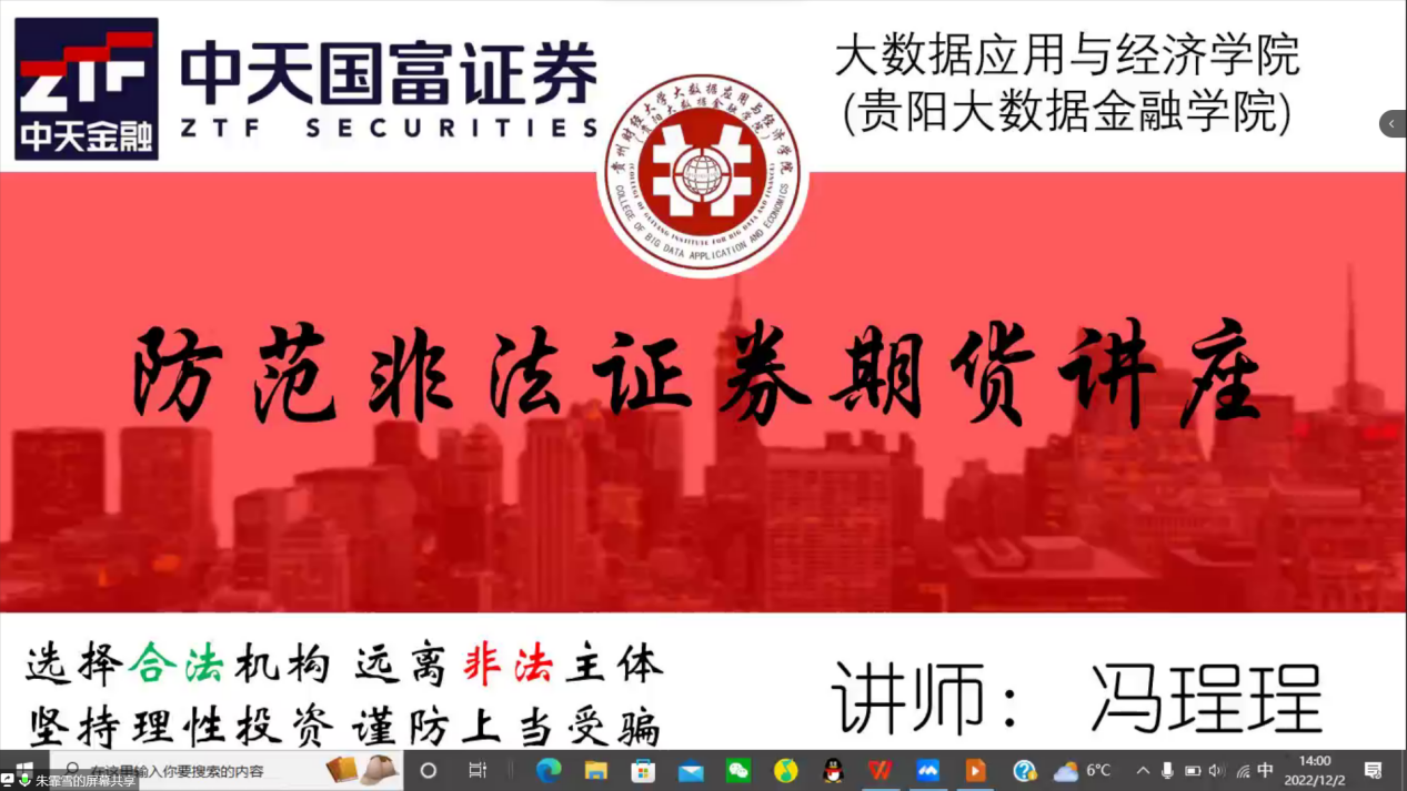 12月2日,大数据应用与经济公司(贵阳大数据金融公司)联合中天国富证券开展关于防范非法证券期货学术的主题讲座。本次讲座由中天国富证券冯珵珵作为主讲人,公司朱霏雪同学主持,共计200余名师生聆听了该讲座。
