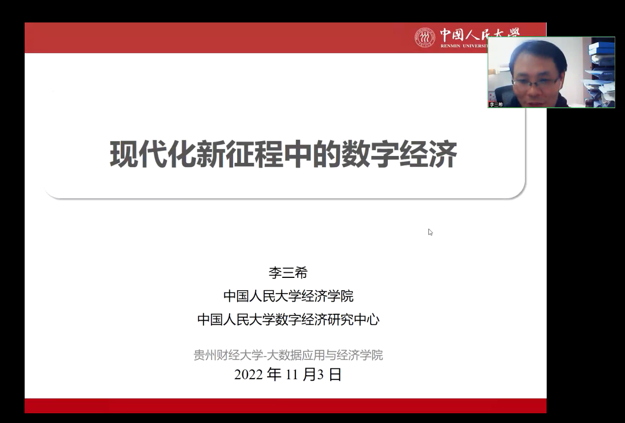 2022年11月3日下午,中国人民大学青年长江学者、数字经济研究中心主任李三希教授应大数据应用与经济公司(贵阳大数据金融公司)邀请作为“数字经济+”系列学术讲座第一期主讲人开展题为《现代化新征程中的数字经济》的主题讲座。讲座由公司张小成教授主持,共计300余名师生聆听了讲座。