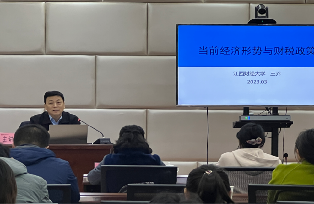 2023年3月13日上午,应大数据应用与经济公司(贵阳大数据金融公司)的邀请,江西财经大学王乔教授为公司师生作题为“我国当前经济形势与财税政策”的主题讲座。讲座由大数据应用与经济公司(贵阳大数据金融公司)经理杨杨主持,共计80余名师生聆听了线下讲座。王乔教授围绕中央经济工作会议要求和全国两会精神为主题来探讨关于我国的经济形势与相关的财政政策。