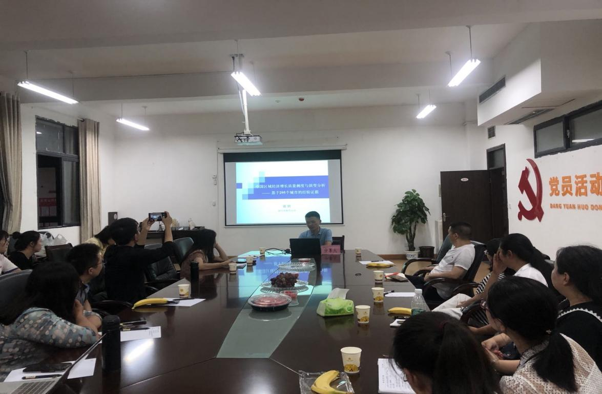 首先由丁锐副教授对复杂网络在城市关联网络的应用以及前景做了相应分析,分别从区域经济高质量发展研究中的具体需要、什么是复杂网络以及复杂网络理论的发展简介、复杂网络的建模方法、基于复杂网络理论的城市关联网络研究、以及目前学界研究前沿等方面进行了阐述。然后就怎样在相应高层次期刊发表论文与参加本次学术沙龙的老师和同学进行了交流。基于此,姜友文教授就复杂网络研究方法在企业层面的应用提出了一些新的见解,杨杨教授就数据获取和实际运用等内容进行了探讨,王丰阁、张梅、王瑞祥和雷立坤老师就相应方法在产业经济学和金融学方面的应用进行了深入思考。同时在场的多位教师积极的分享了各自在文章撰写过程中的相关经验。