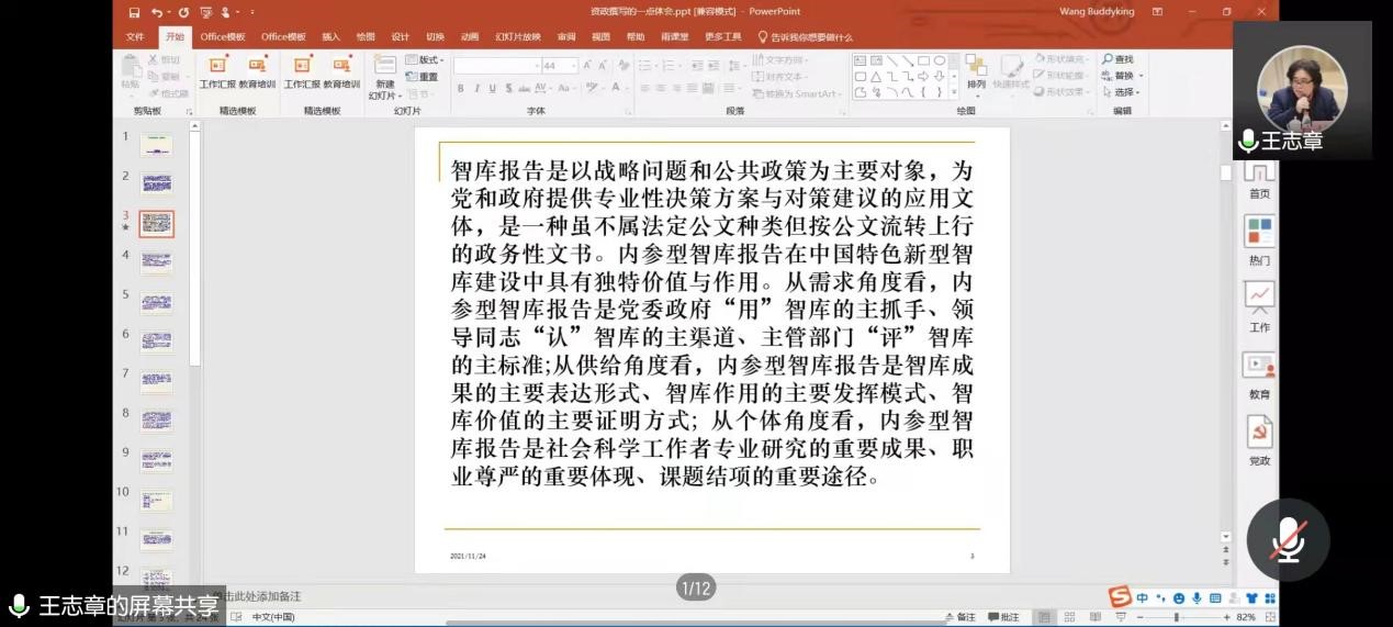 2021年11月24日晚,应大数据应用与经济公司(贵阳大数据金融公司)邀请,武汉大学管理学博士、西南大学经济管理公司王志章教授做客公司三大论坛之“经济论坛”,通过线上讲座的形式,作题为“智库报告撰写的技巧”的学术讲座。由于疫情防控工作需要,本次讲座特通过腾讯会议进行网络直播,讲座由大数据应用与经济公司(贵阳大数据金融公司)经理杨杨主持,公司100余名师生聆听讲座。