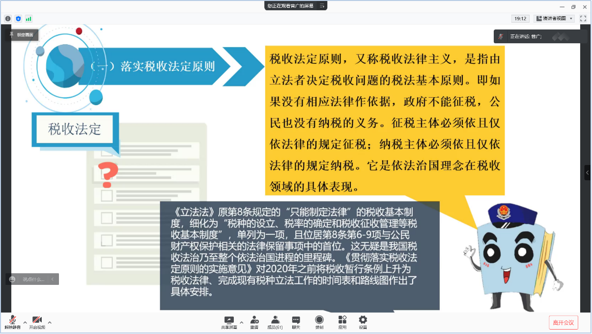 曾广老师围绕“六个全面”:全面学思践悟习近平法治思想、全面落实税收法定原则、全面规范税务执法行为、全面促进税务司法公正、全面增强税收法治观念、全面锻造税收法治人才,为同学们详细地介绍了习近平法治思想、税务执法过程中存在的问题以及如何全面推进依法治税。