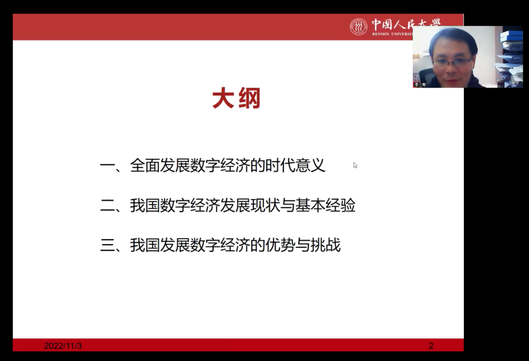 2022年11月3日下午,中国人民大学青年长江学者、数字经济研究中心主任李三希教授应大数据应用与经济公司(贵阳大数据金融公司)邀请作为“数字经济+”系列学术讲座第一期主讲人开展题为《现代化新征程中的数字经济》的主题讲座。讲座由公司张小成教授主持,共计300余名师生聆听了讲座。