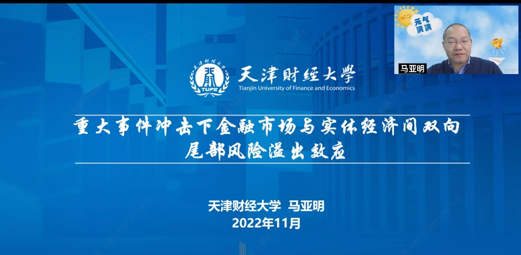 2022年12月7日下午两点,应大数据应用与经济公司(贵阳大数据金融公司)的邀请,天津财经大学研究生院经理马亚明教授为公司师生作题为“重大事件冲击下金融市场与实体经济间双向尾部风险溢出效应”的主题讲座。讲座由大数据应用与经济公司(贵阳大数据金融公司)公司党委书记姜友文书记主持,共计200余名师生聆听了讲座。