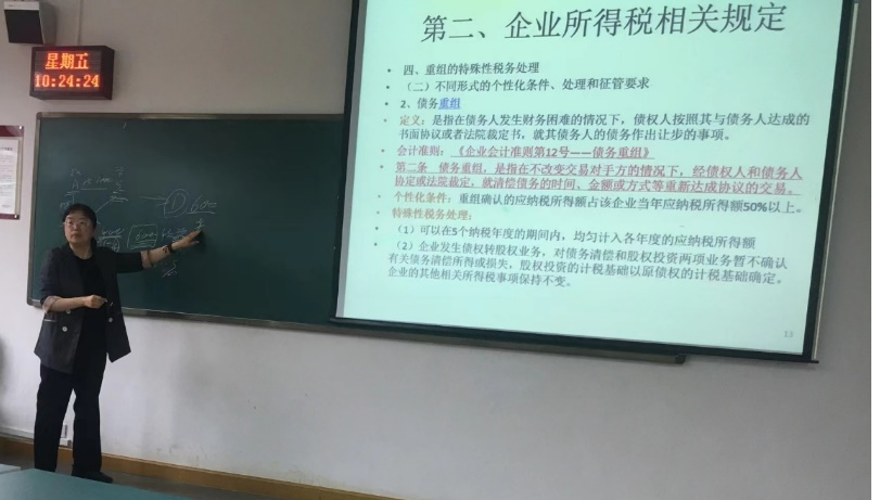 2023年4月21日上午,公司邀请税务硕士(MT)校外合作导师、立信税务师事务所(贵州)有限公司副总经理陈应琴同志为税务硕士研究生进行了题为《居民企业间重组、股权资产划转之企业所得税》的专题讲座。本次讲座在明德楼323教室举行,由税务硕士(MT)硕导组副组长黄江玉副教授主持。2022级税务硕士(MT)的同学参加了讲座。