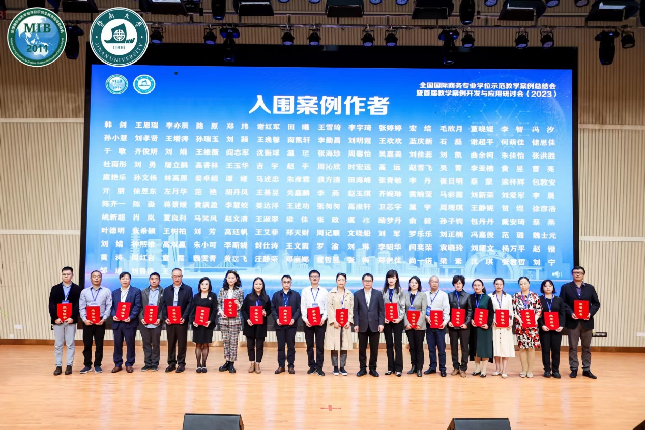 会议举行了为示范案例入库征集活动的入围作者颁发证书仪式。对外经济贸易大学大学教授、国际商务教指委秘书长蓝庆新宣读了示范案例入库作者及案例题目。公司共有4个案例入库。对外经济贸易大学副董事长、国际商务教指委副主任委员洪俊杰为案例入库作者颁发了证书。时宏远、赵平和张梅分别上台领奖。