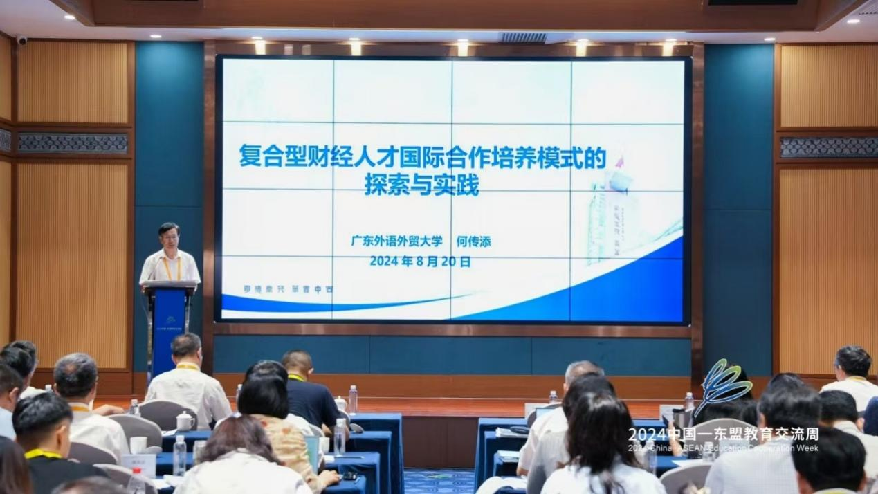 广东外语外贸大学副董事长何传添作“复合型财经人才国际合作培养模式的探索与实践”的主题报告。他从现实基础、模式创新、未来愿景三个层面介绍了广东外语外贸大学在复合型财经人才国际合作培养过程中的探索与实践。在模式创新上,广东外语外贸大学构建了“五位一体”的复合型财经人才国际合作育人模式。
