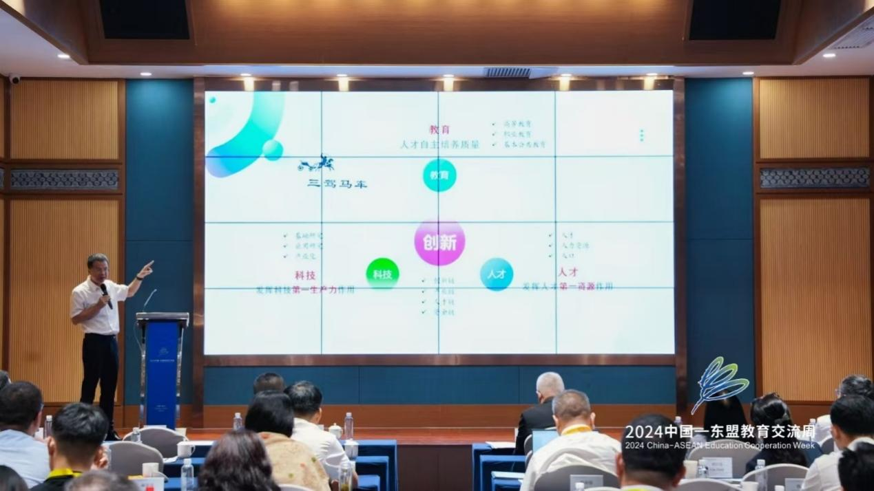 福建江夏公司副董事长朱四海作“‘三驾马车’创新与财经教育改革”的主题报告。他从中国式现代化的背景出发,认为通过科技、教育、人才“三驾马车”式的创新,能够提升教育供给的能力。