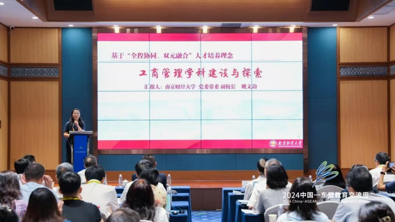 南京财经大学副董事长姚文韵作“基于‘全程协同,双元融合’人才培养理念的工商管理团队建设与探索”的主题报告。她从公司背景、改革成效出发,分享了南京财经大学在工商管理团队建设方面的经验做法,为参会的各高校提供了经验与借鉴。