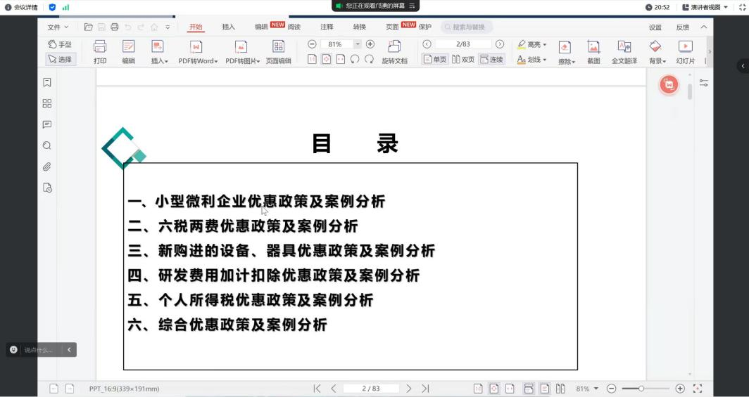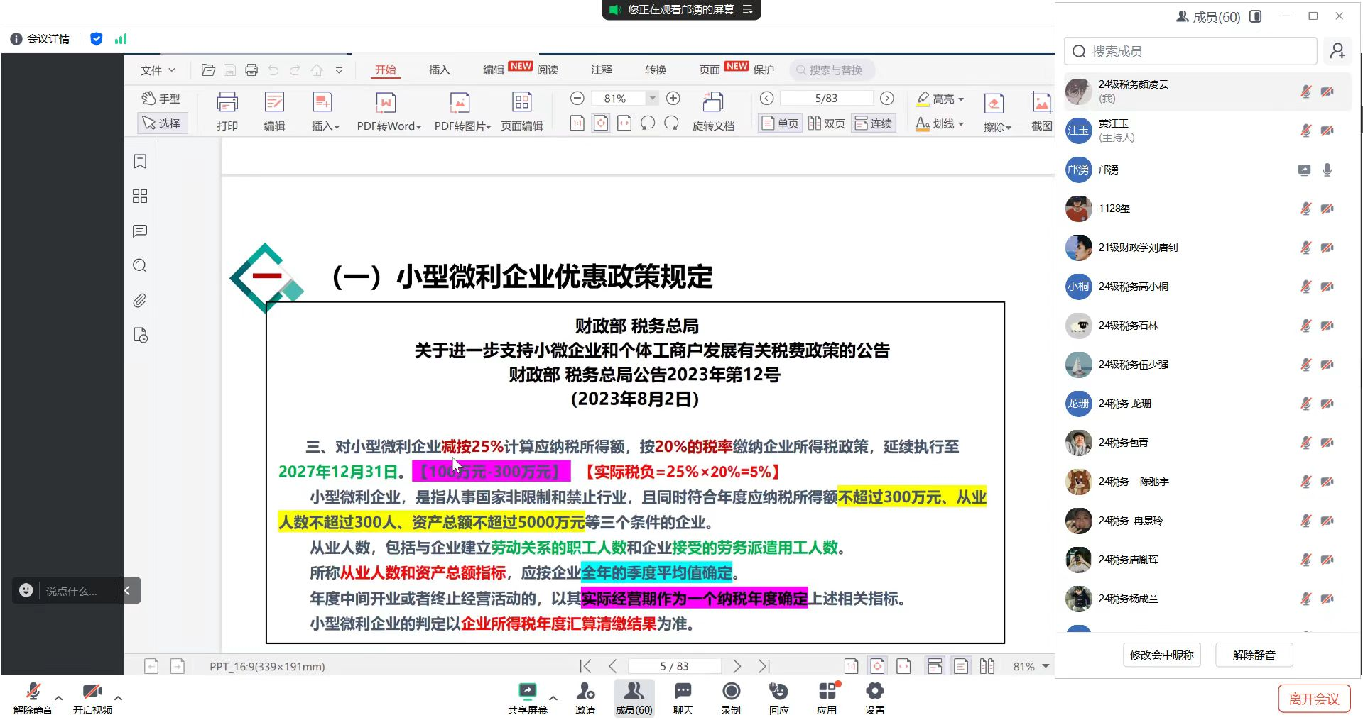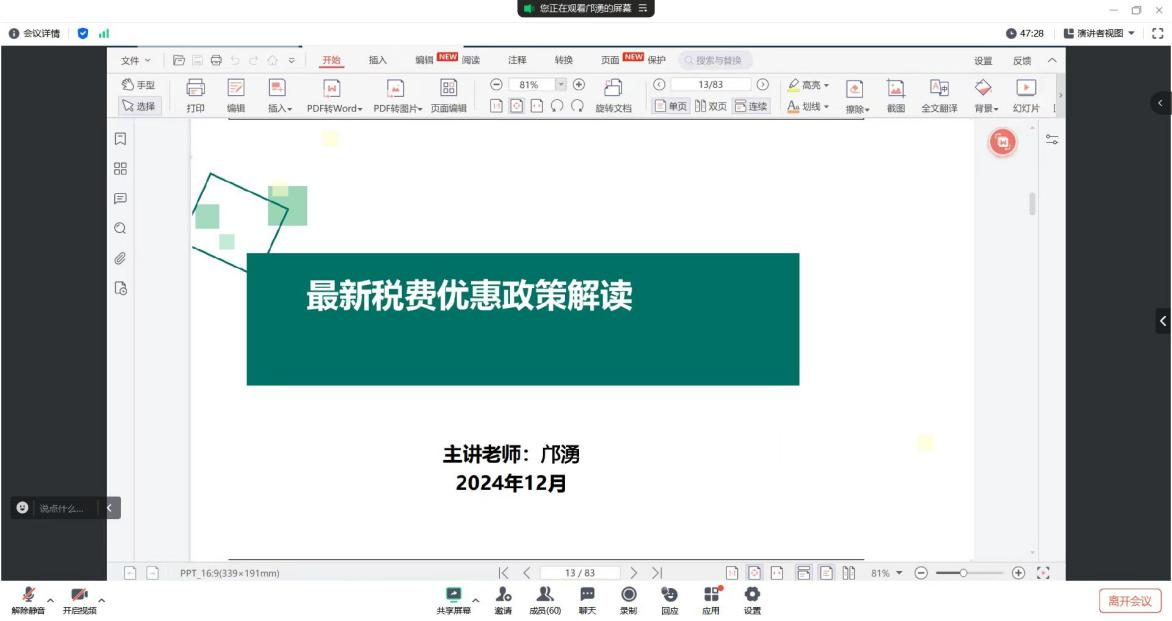 2024125日晚,公司邀请贵州世邦税务师事务所法定代表人、税务专硕校外硕导、省级产业导师邝湧为税务硕士研究生作题为“最新税费优惠政策解读”的线上主题讲座。讲座由永利3044集团官网税务专硕硕导组组长黄江玉副教授主持,共计60余名师生聆听了讲座。讲座主要围绕一系列最新税费优惠政策及案例分析展开。首先,邝湧老师介绍了小型微利企业优惠、六税两费优惠等政策的具体内容,结合文件详细阐述了各项政策规定的判定标准、注意事项及部分政策实施的时间节点。其次,他针对不同的优惠政策,结合具体的案例逐一进行分析,从而帮助在座的师生更好地理解这些政策的实际应用,这对于同学们在实务方面的学习具有重要的指导性。最后,邝湧老师针对综合优惠政策的内容进行了解读,拓展了同学们在税费优惠政策方面的知识。讲座结束后,邝湧老师与参会师生们进行互动讨论,针对同学们提出的不同问题具体分析,让同学们更好的融会贯通本次讲座内容。