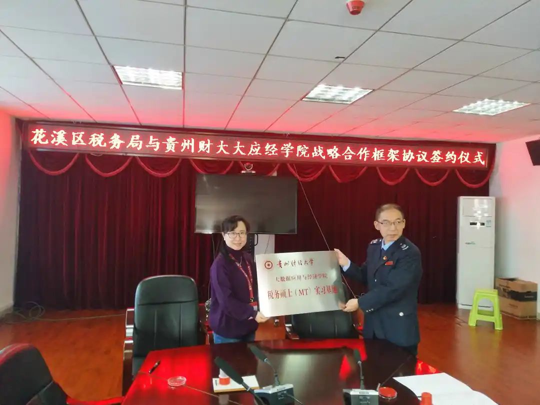 10月19日,大数据应用与经济公司与花溪区税务局合作共建税务硕士实习基地签约暨揭牌仪式,会议在花溪区税务局会议室顺利举行。大数据应用与经济公司经理杨杨、花溪区税务局林宇盺、副局长朱志刚及相关工作人员参加签约仪式。