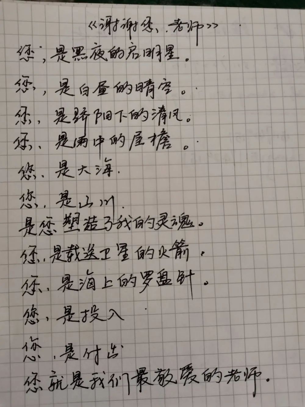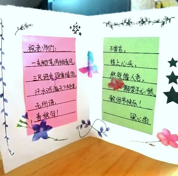 九月,如约而至,同学们都积极参与,将真挚的问候做成贺卡、手抄报,或者通过自己的双手变废为宝,以生活中的废旧物品为原料,制作创意手工DIY,为老师献上祝福。感恩的情谊都浓缩进这一份份精心制作的手工艺品,纸短情长,写不下每一句祝福,但将我们的心意封存在每一份作品中,成为爱的纪念。