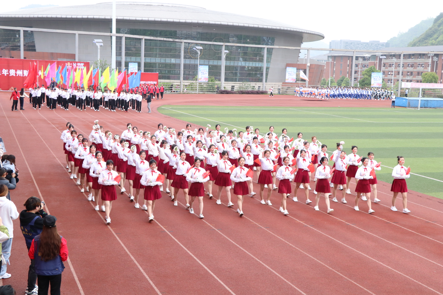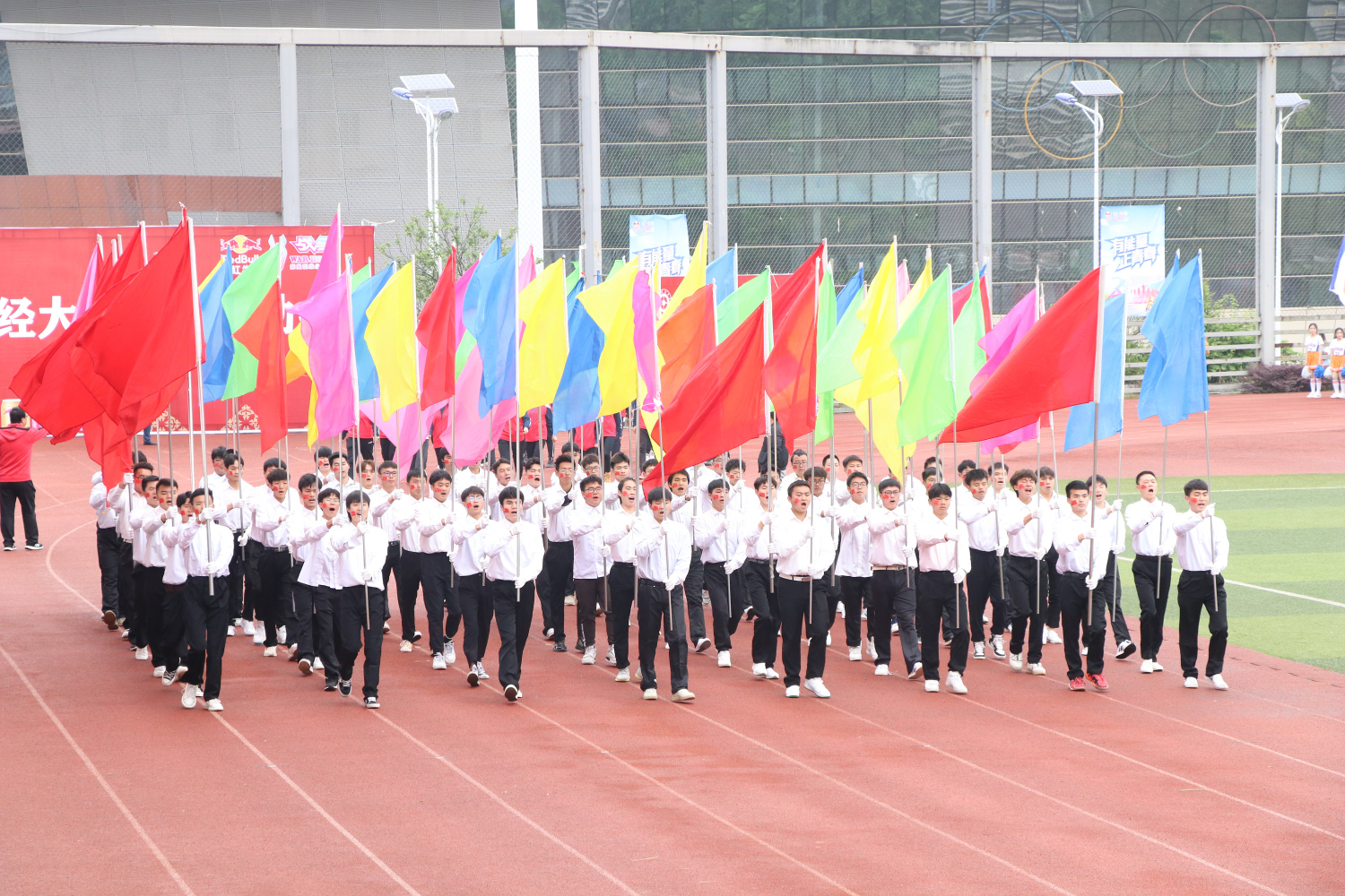 在国歌声中,校国旗护卫队庄重地托举着国旗、校旗迎面走来;公司校徽校训方队带着坚定与骄傲,托举寓意“以人为本、儒魂商才”的校徽,英姿飒爽,高举“厚德博学、笃行鼎新”的校训,直往前方;鲜花方队捧着五彩缤纷的花束向运动会献礼,挥动着色彩斑斓的花束在向领导致意;彩旗方队昂首挺胸,意气风发,迈开了迎向美好未来的坚定步伐,朝气蓬勃的精神,映射着改革开放更进一步的新气象;99人方阵队伍手挥国旗,紧握院旗,高举字牌,彰显了贵财学子青春靓丽的风彩。