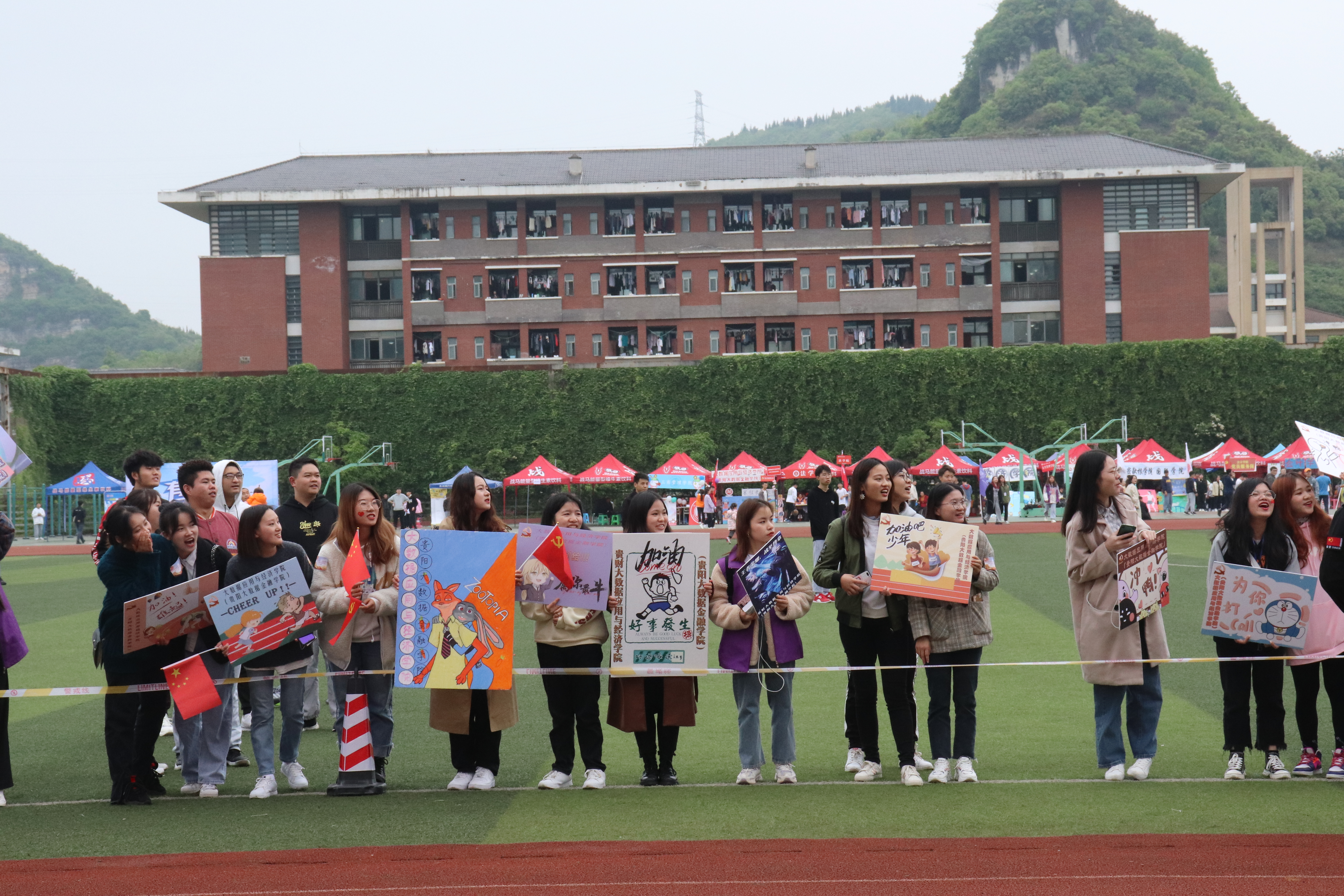 师生齐上阵,赛场战风云,他们热情饱满、勇敢无惧;他们活力无限、永不言弃。随着比赛的进行,观众席上党员服务队的志愿者们更是深受感染、热情高涨。他们散落在运动场的每一个角落,有的陪运动员检录,有的在胜利的终点等待着运动员的到来,有的撰写加油稿激励运动员勇往直前。他们更用一句句加油呐喊、一阵阵擂鼓助威、一遍遍鼓掌摇旗、一棒接一棒的陪跑,全心全意地投身于运动会的组织建设中,使运动员们深受感染,斗志昂扬!