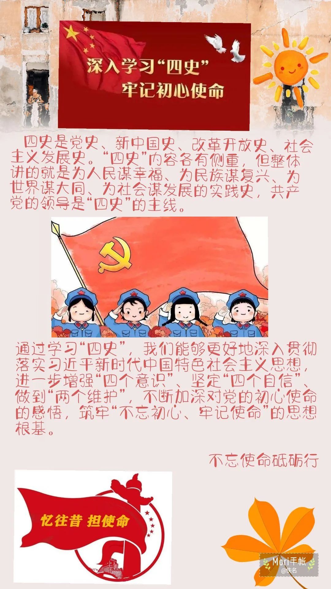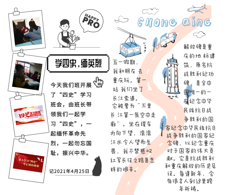 公司组织全校师生开展网上重走学习教育长征路,以及开展“四史”学习教育竞答活动,并在4月24日下午14:00组织师生于人民网观看“同上‘四史’思政大课”。与此同时,公司于4月25日下午在普惠金融工作室举办“学好‘四史’,牢记初心使命”主题知识竞赛决赛,更好地学习贯彻了“四史”精神。相关活动的开展拓展了师生学习“四史”的途径,也丰富了学习“四史”的形式。本月同学们继续坚持采用手绘、贴纸、照片、手抄等方式制作“青春手帐”,记录下学习“四史”的心得与感悟,表达自己对“四史”精神的理解和学习“四史”的坚定决心。