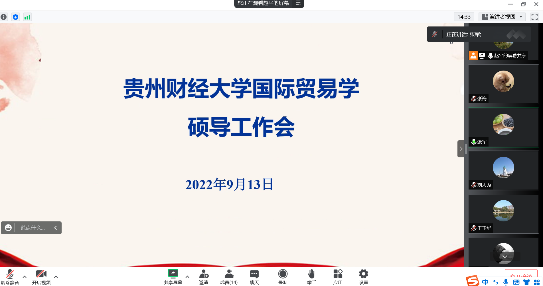 2022年9月13日13:30-16:30,公司国际贸易学硕导组和国际商务硕导组召开线上导师工作会议,国际贸易学硕导组组长张军教授和国际商务硕导组组长赵平教授、副组长张梅副教授共同主持会议,两个硕士培养点的全体导师参加了会议。