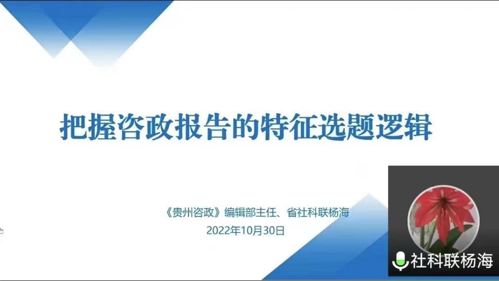 2022年10月30日下午,应大数据应用与经济公司(贵阳大数据金融公司)的邀请,《贵州咨政》编辑部主任杨海主任为公司师生作题为“把握咨政报告的特征选题逻辑”的主题讲座。讲座由大数据应用与经济公司(贵阳大数据金融公司)党委书记姜友文主持,共计200余名师生聆听了讲座。