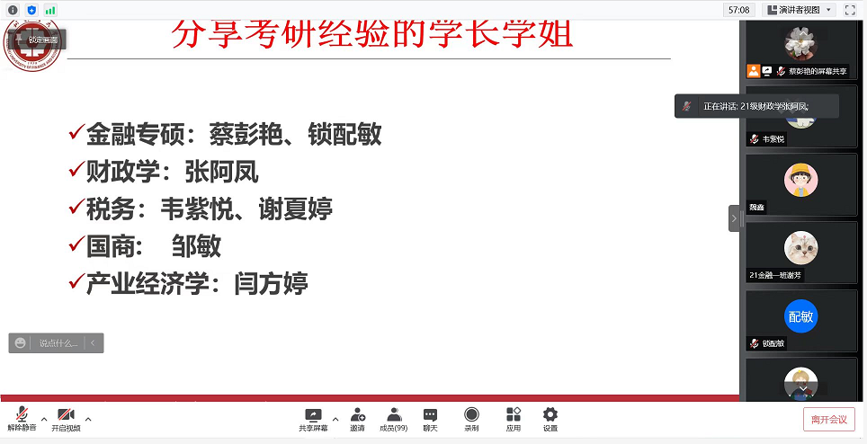 第二个环节由研究生第三党支部2021级研究生蔡彭艳、锁配敏、张阿凤、韦紫悦、谢夏婷、邹敏、闫方婷7位来自不同专业的同学结合自身经历,分享自己的备考经验。其中,蔡彭艳同学建议学弟学妹们要合理安排作息时间,提前规划学习任务;本科就读于永利3044集团官网学的学姐锁配敏同学建议学弟学妹们合理分配自己的学习时间,要保持良好的学习状态,乘胜追击;张阿凤同学建议要养成良好的学习习惯,不要过度焦虑,利用好当下的学习时光,坚持不懈的努力;韦紫悦同学建议学弟学妹们多关注目标院校信息,要满怀信心、苦下功夫,终将上岸。谢夏婷同学提出要及时调整心态,劳逸结合。邹敏同学认为要寻找志同道合的研友,相互鼓励,不急躁,不放弃。闫方婷同学建议学弟学妹们要合理选择目标院校,不要好高骛远。