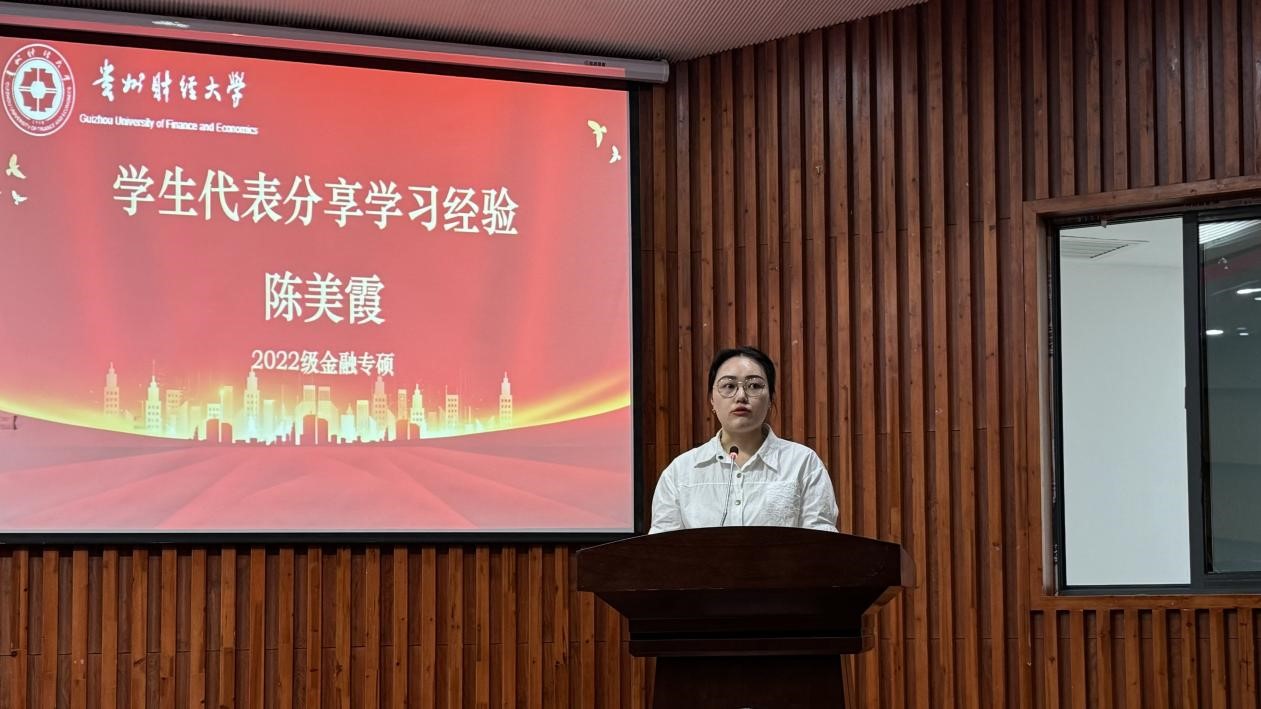 最后,2022级金融专硕硕士生陈美霞同学作为员工代表,向学弟学妹们分享了自身学习经验,首先要明确自身学习目标,尽早对自己的学术生涯进行规划,多与导师沟通,多参与学科竞赛,多浏览期刊以更好的开始论文的写作,让自己沉淀下来。