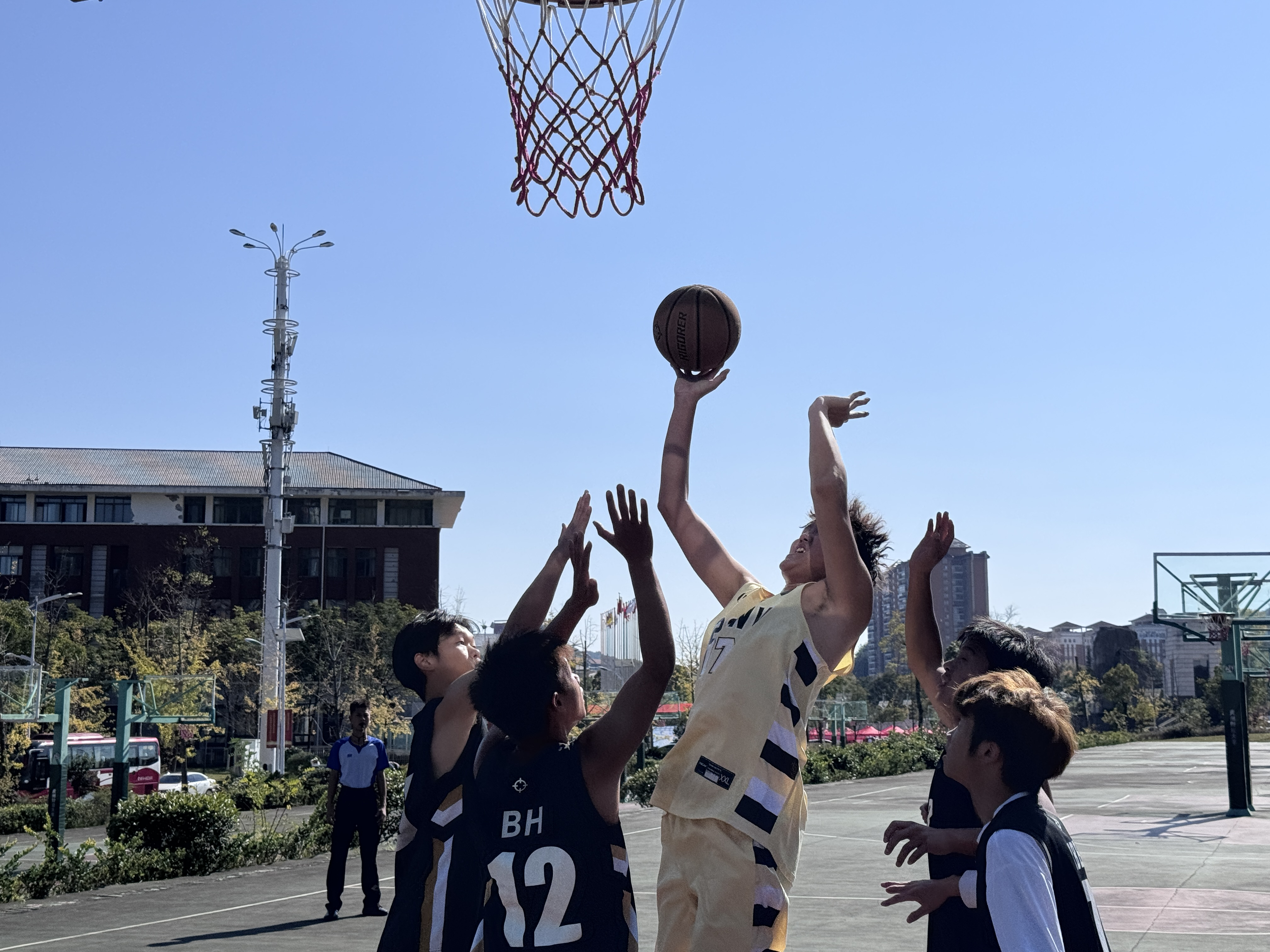 赛场上,各队球员们斗志昂扬,身手矫健,传球、带球、投篮,一系列动作行云流水,展现出了高超的篮球技巧和激昂的篮球热情。他们在球场上尽情挥洒汗水,每一次进攻和防守都扣人心弦。场下的观众们也热情高涨,欢呼声、呐喊声此起彼伏,他们为球员们加油助威,形成了一道独特的风景线。