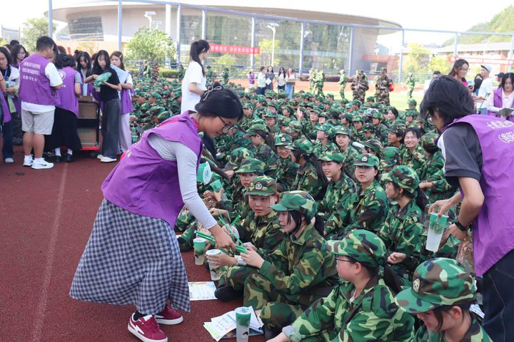 随后院领导班子带领慰问志愿者向艰苦训练的新生及教官发放军训慰问物品。送到新生手中的饮品和小面包,不仅是物质层面上的有力支持,更代表着公司领导们对新生们深切的关怀与殷切的鼓励。