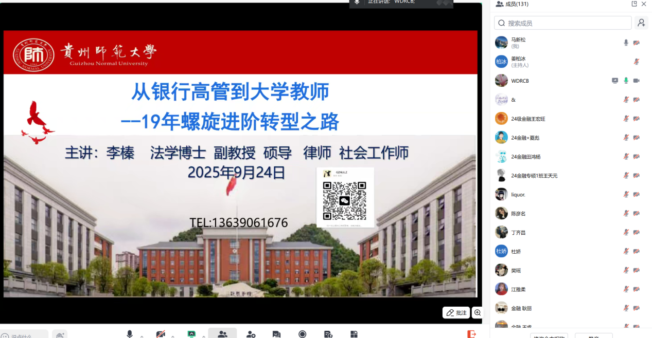 讲座中,李榛老师结合自身十九年职业发展历程,分享了从银行基层岗位逐步晋升至高级管理职位,最终转型投身教育行业的螺旋式进阶路径。他详细阐述了职业转型中的关键节点与挑战,并分析了银行业在金融科技推动下的数字化转型趋势。针对员工职业规划,李榛强调跨学科知识融合与终身学习能力的重要性,提出金融人才需兼具理论与实践能力以适应行业变革。