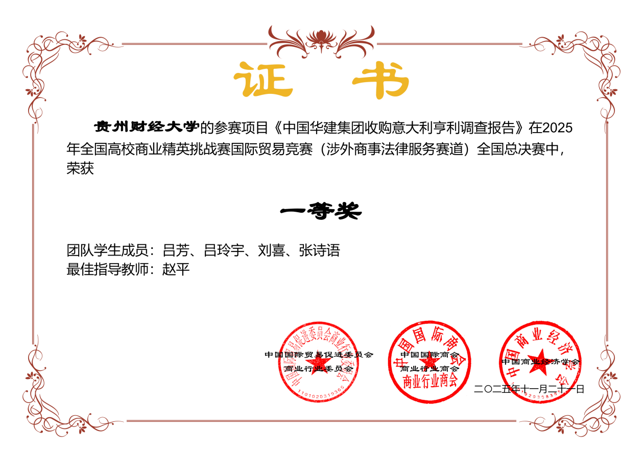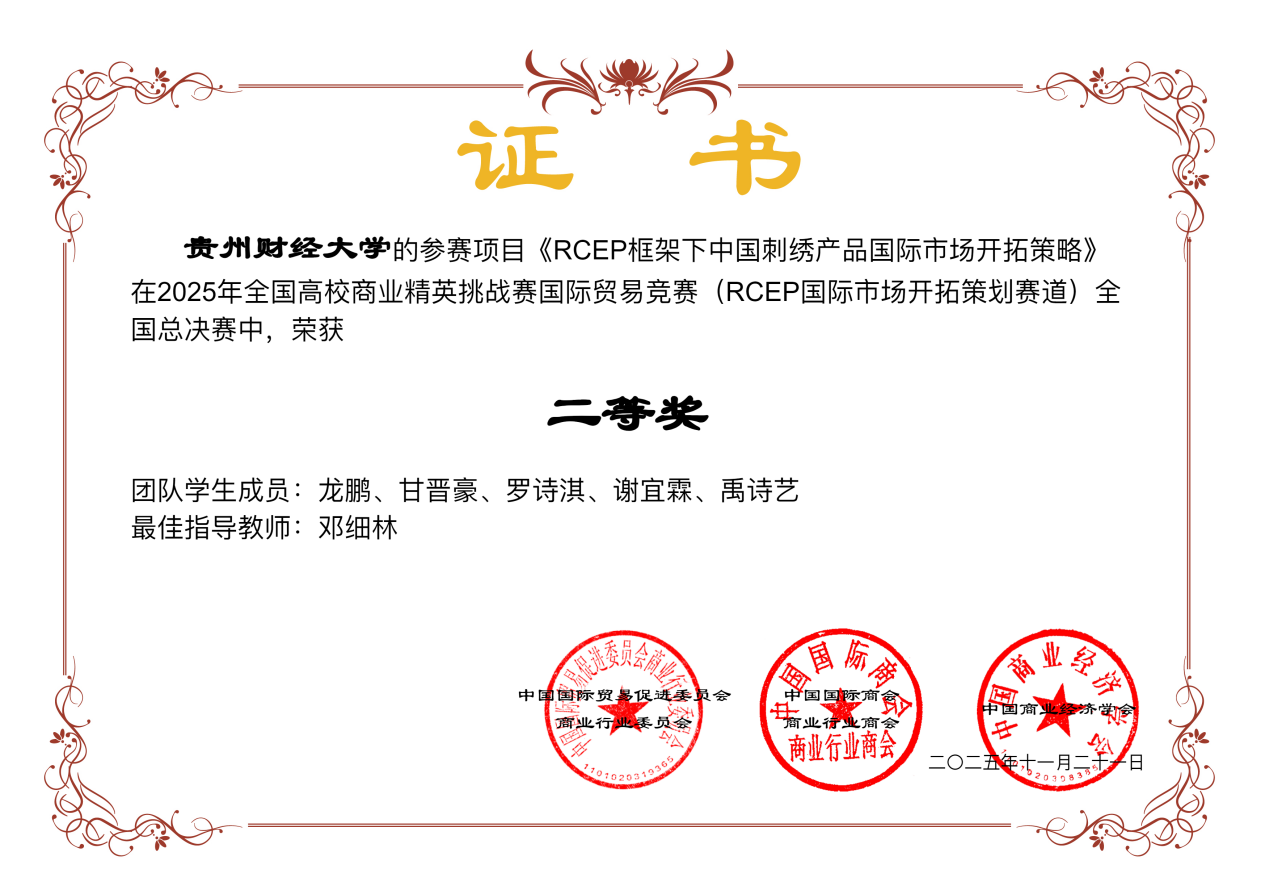 在2025年全国高校商业精英挑战赛国际贸易竞赛中,公司国际经济与贸易系本科员工积极参赛,在16名指导老师的认真指导下,合计68名同学 、15支队伍获得全国奖项,荣获本科生组全国一等奖1项、二等奖7项、三等奖7项。公司获“最佳院校组织奖”。从四个分赛道来看,RCEP国际市场开拓策划赛道有4支队伍获奖,其中获二等奖2项、三等奖2项;国际贸易与商务专题赛道有5支队伍获奖,其中获二等奖3项、三等奖2项;技术性贸易措施评议赛道有4支队伍获奖,其中获二等奖2项、三等奖2项;涉外商事法律赛道有2支队伍获奖,其中获一等奖1项、三等奖1项。