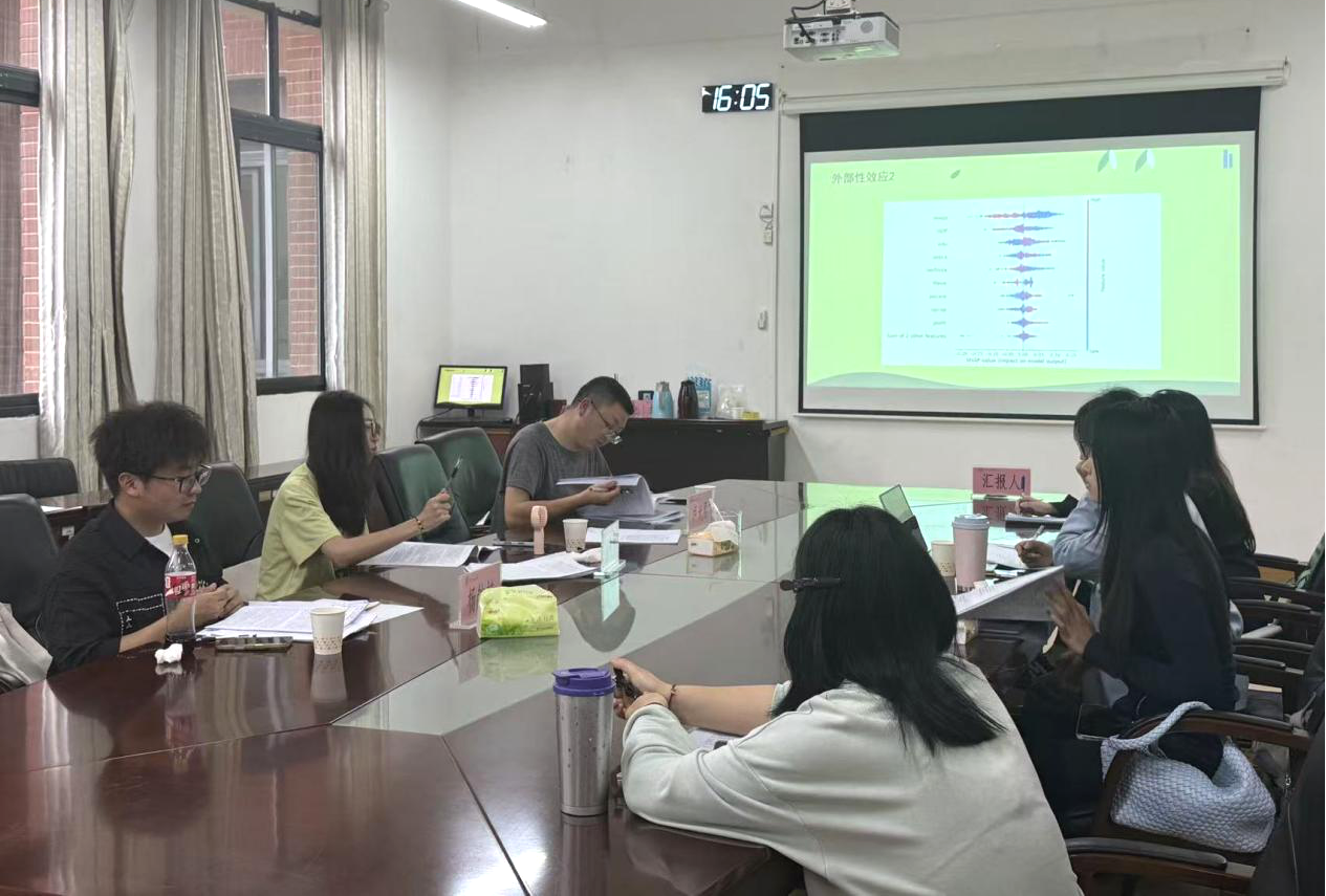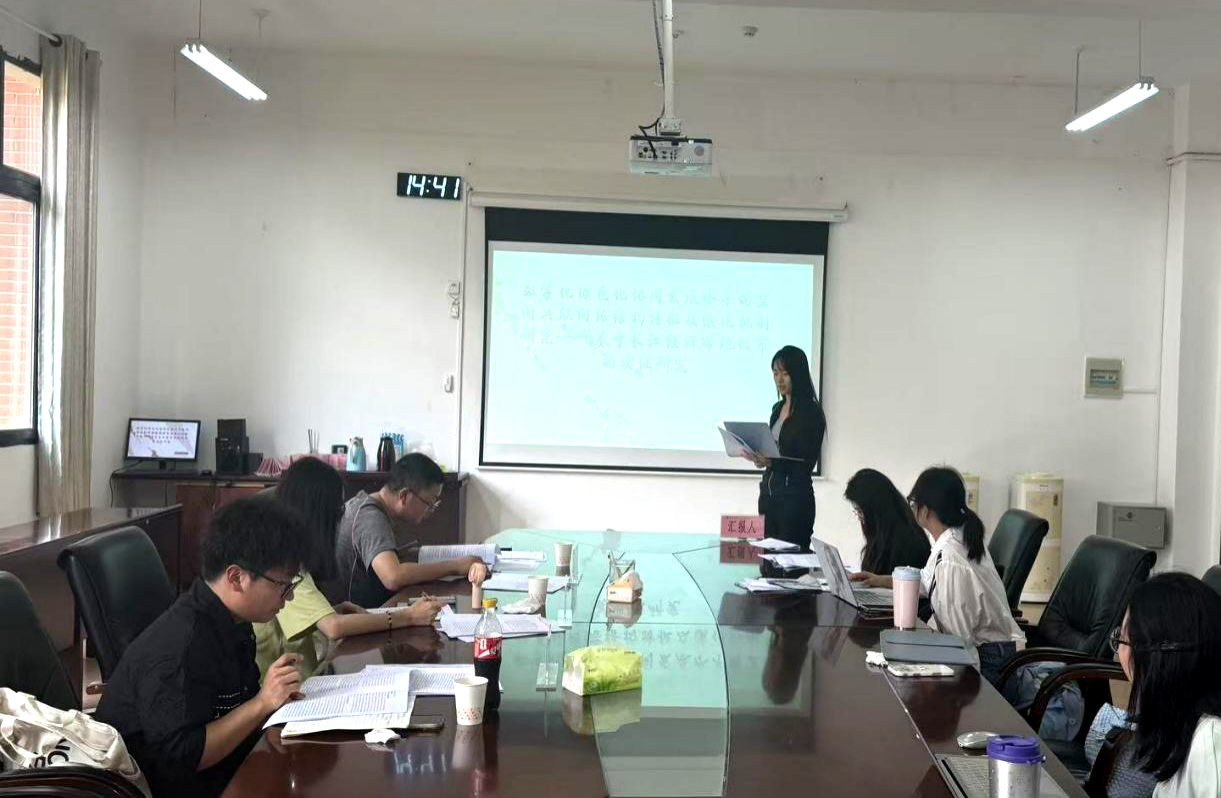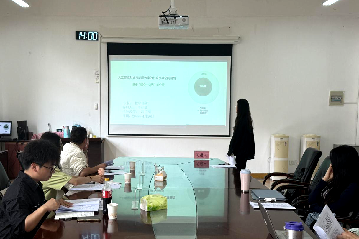 本次论文工作坊共有四位数字经济、数量经济学专业的研究生同学进行论文汇报。首先由申佳敏同学汇报《人工智能政策对城市能源效率的影响研究—基于“核心区—边界区” 空间异质性的分析》,紧接着由沈光辉同学展示《数字产业集聚对工业碳绩效的机制研究》,再者由陈治名同学分享《数字化绿色化协同发展水平的空间网络结构特征及演化机制研究》,张家欣同学最后汇报《碳排放权交易对工业机器人应用的影响研究》。