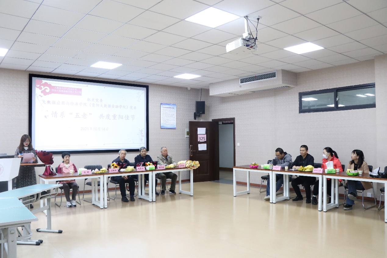为弘扬中华民族敬老爱老的优良传统,贯彻落实《中共教育部党组关于加强新时代全国教育系统关心下一代工作委员会工作的意见》精神。10月14日上午,机关党委与大数据应用与经济公司(贵阳大数据金融公司)党委于明德楼案例室联合开展“情系五老,共度重阳佳节”活动。校关工委常务副主任张昌杰、秦立俊、校关工委委员史恩贤、余敏出席此次活动。