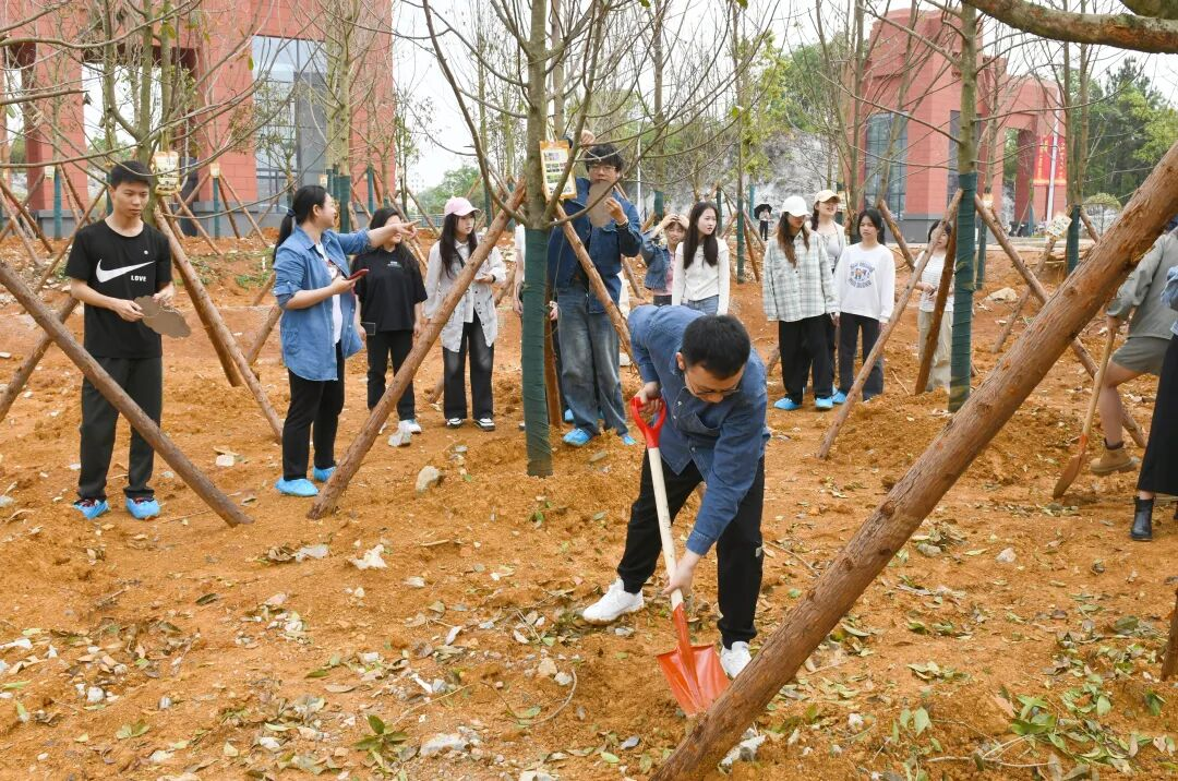 张晓阳、杨勇、刘元贵、李天柱共同为“员工捐建林”揭幕。师生、员工们一起走进员工林,挥锹铲土,培土围堰,悬挂铭牌。一棵又一棵员工树凝结着大家感恩于心、铭志于树、寄情于林的爱校、奉献情怀;一块又一块员工铭牌,既展现了项目捐赠信息,也表达了母校对捐赠方的尊敬与敬意。
